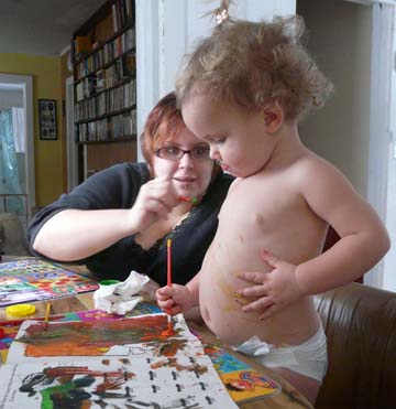 Mom was quick to strip off the new pants and t-shirt lest they become an unwitting canvas for the budding artist. It was a wise move. Kelsey’s hands quickly became covered with paint which she immediately wiped clean on her belly. Then came the face painting. Kelsey painted Oma and Aunt Amia, and we returned the favor.