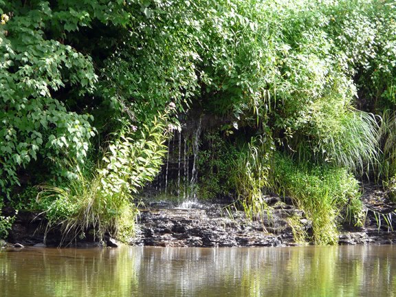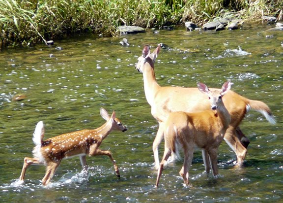Last weekend was the annual Crary Camp in Gaines, Pa. The group was small this year, but we had great fun. It’s a little scary to find a crew as crazy as my native clan, but nice to feel so comfortable being with them. We biked the rail trail along a meandering stream and stumbled on what I believe is a timber rattlesnake, sunning just at the edge of the trail. A few minutes later we saw these three deer splashing and playing in the stream. The butterfly – a red admiral – didn’t want to open his wings long enough for me to capture his beautiful orange-red markings, but I got a decent picture anyway. The cascade across the river from camp was so intriguing I had to include it as well. Looking forward to camp next year – and our trip to Michigan next week!