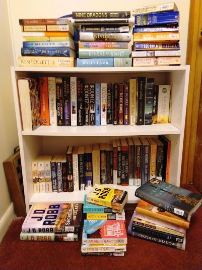 Here’s a picture of my bookshelf. The books within the bookcase itself are my “don’t want to part with” books. Historical fiction and mystery of course, but also a little Dean Koontz and Stephen King, a Merlin trilogy, and a few others I particularly loved. The books piled around the case are mostly recent reads: I’ll eventually give them to my kids or my sister. (Of course the JD Robb books stay.)