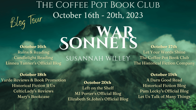 Tomorrow’s the day! My Blog Tour from Coffee Pot Book Club sets off for a week of website visits. Each site will feature a post promoting War Sonnets with a blurb, an excerpt from the book, and an author bio. (Links to each site are listed below the image.)