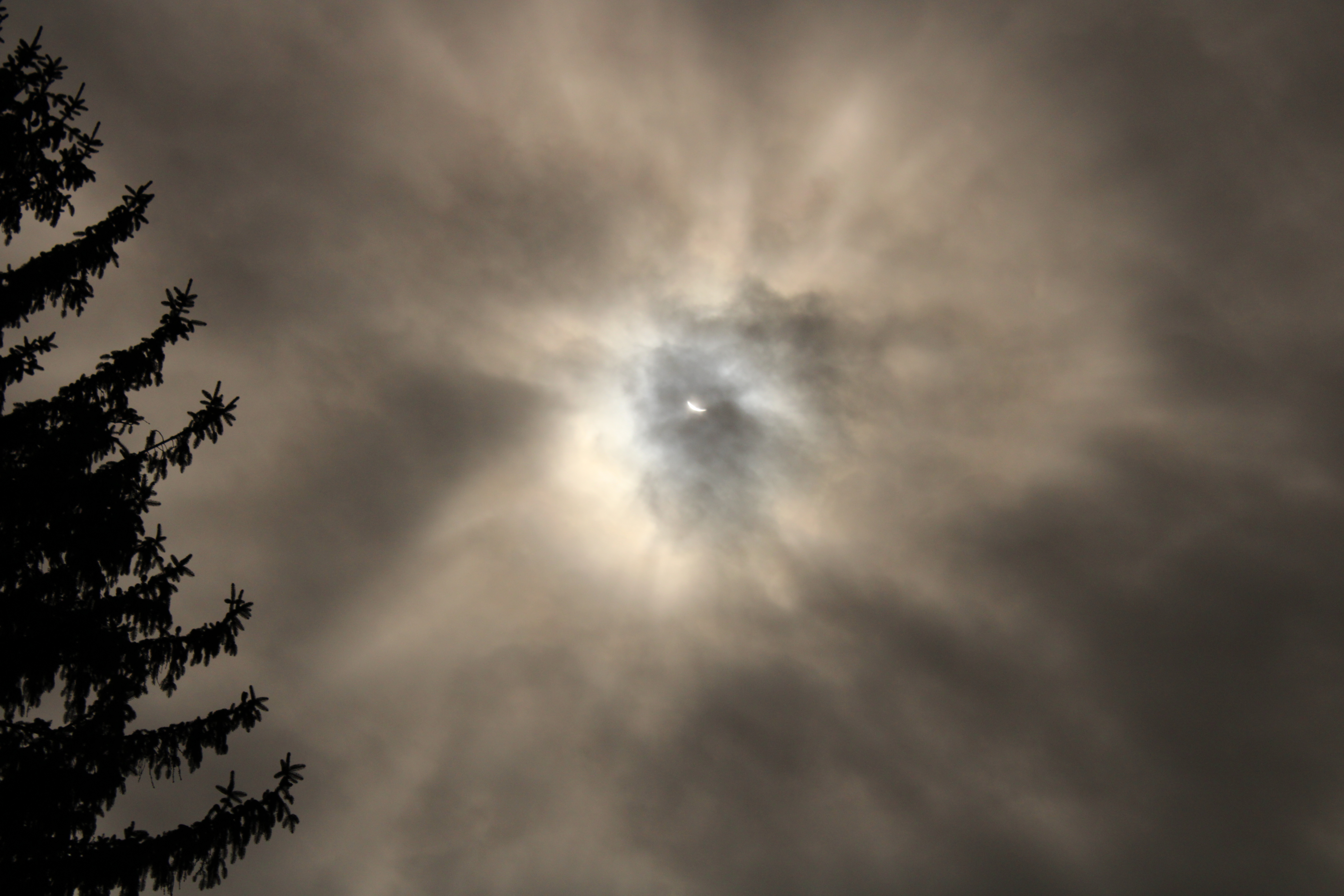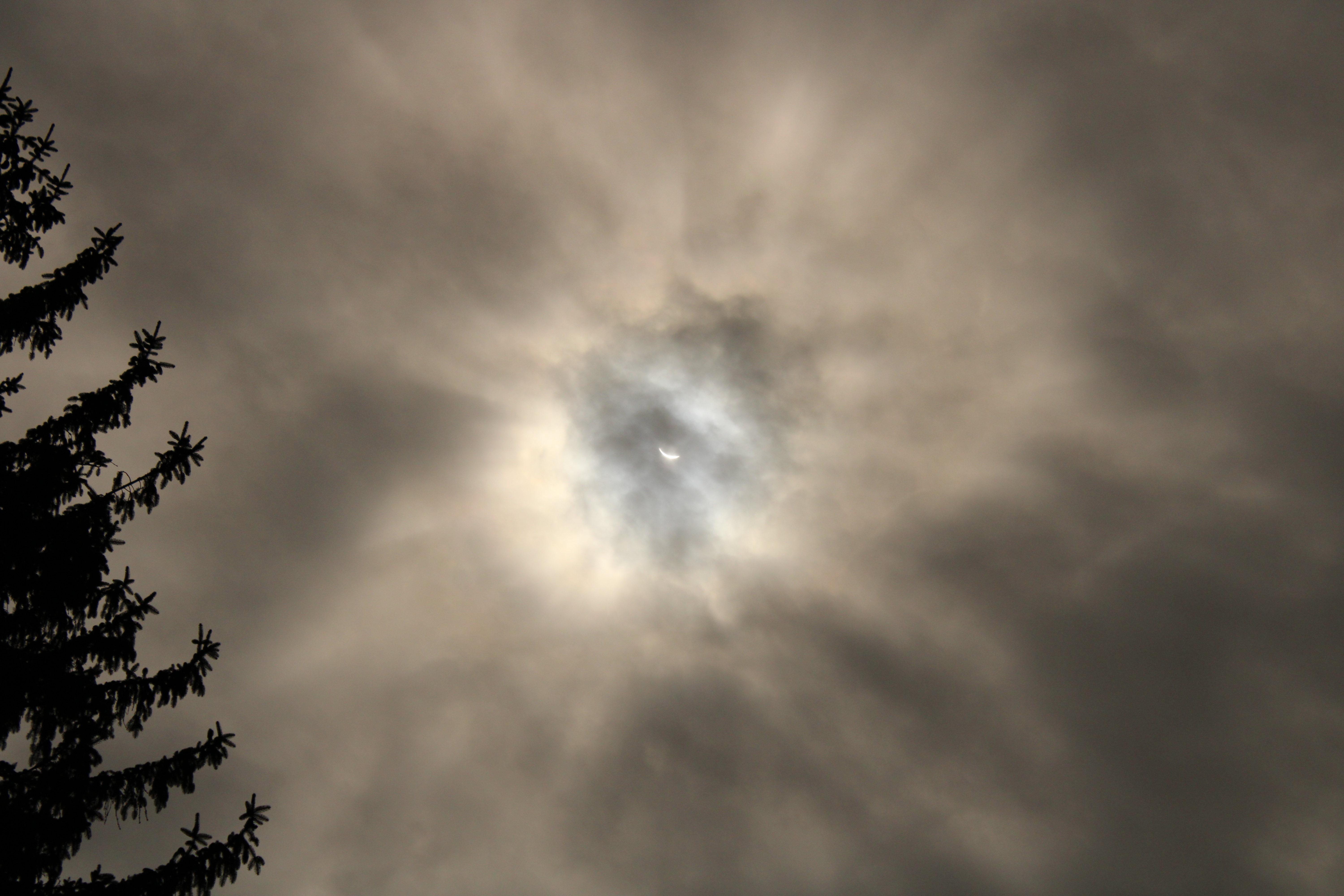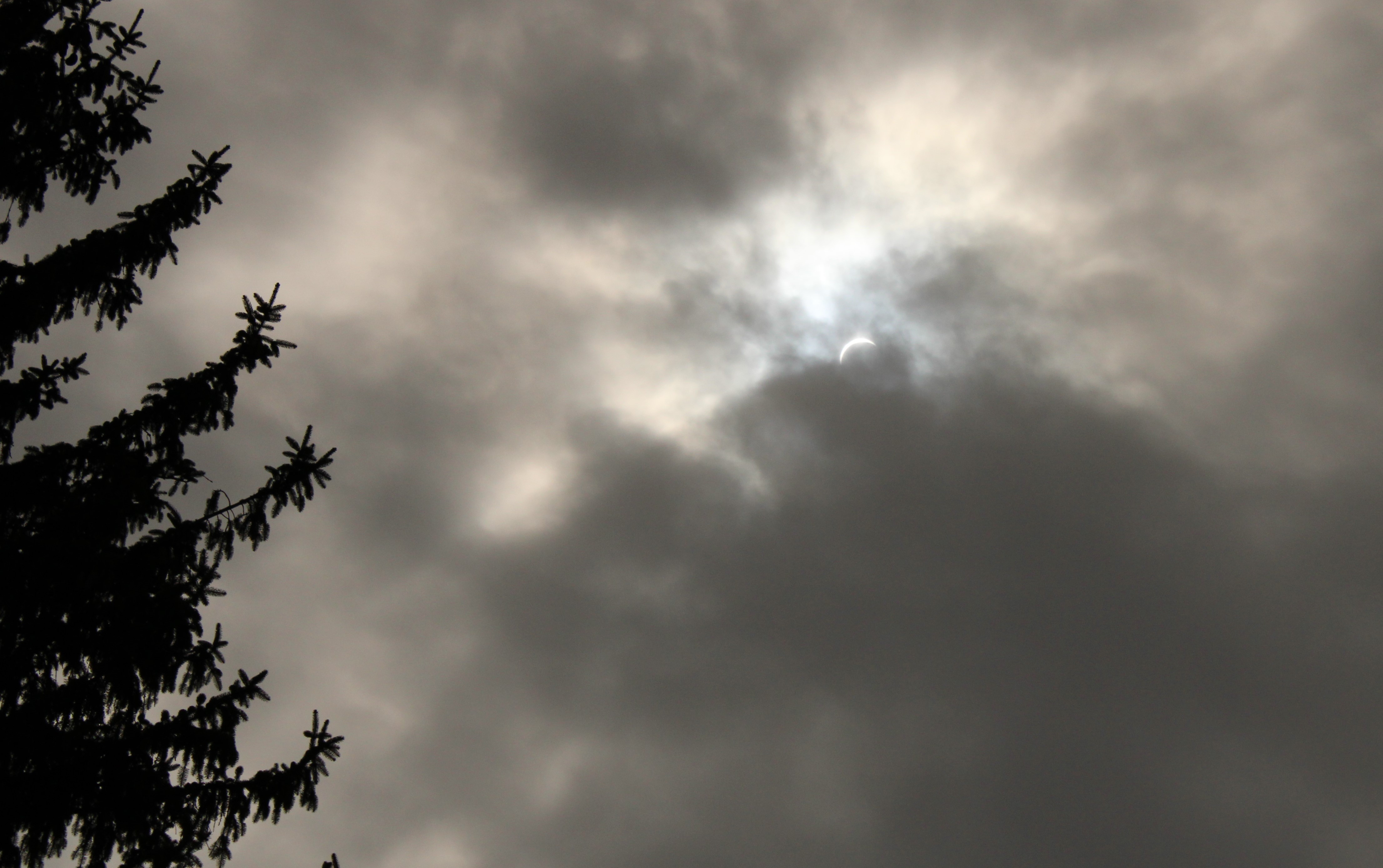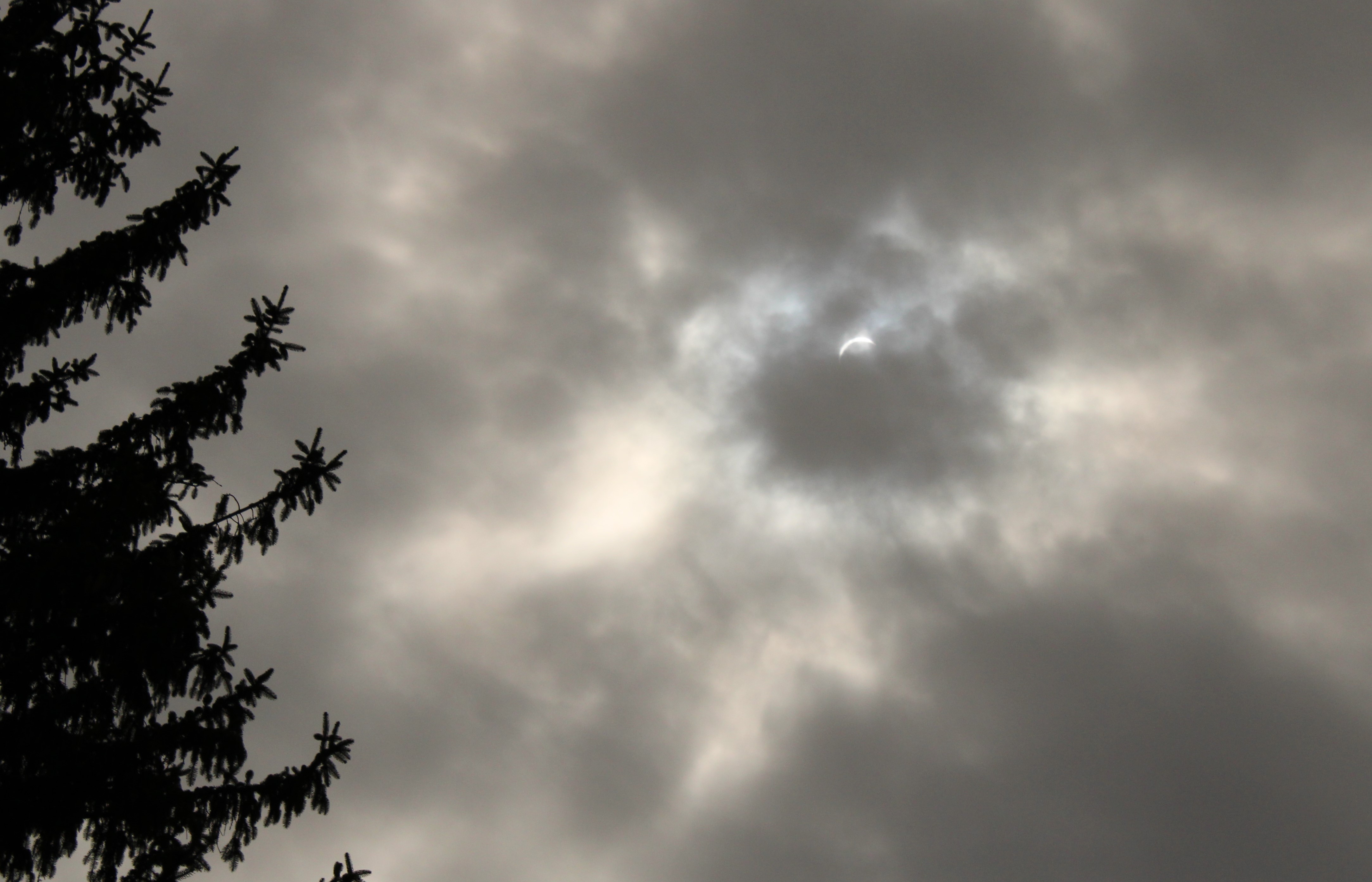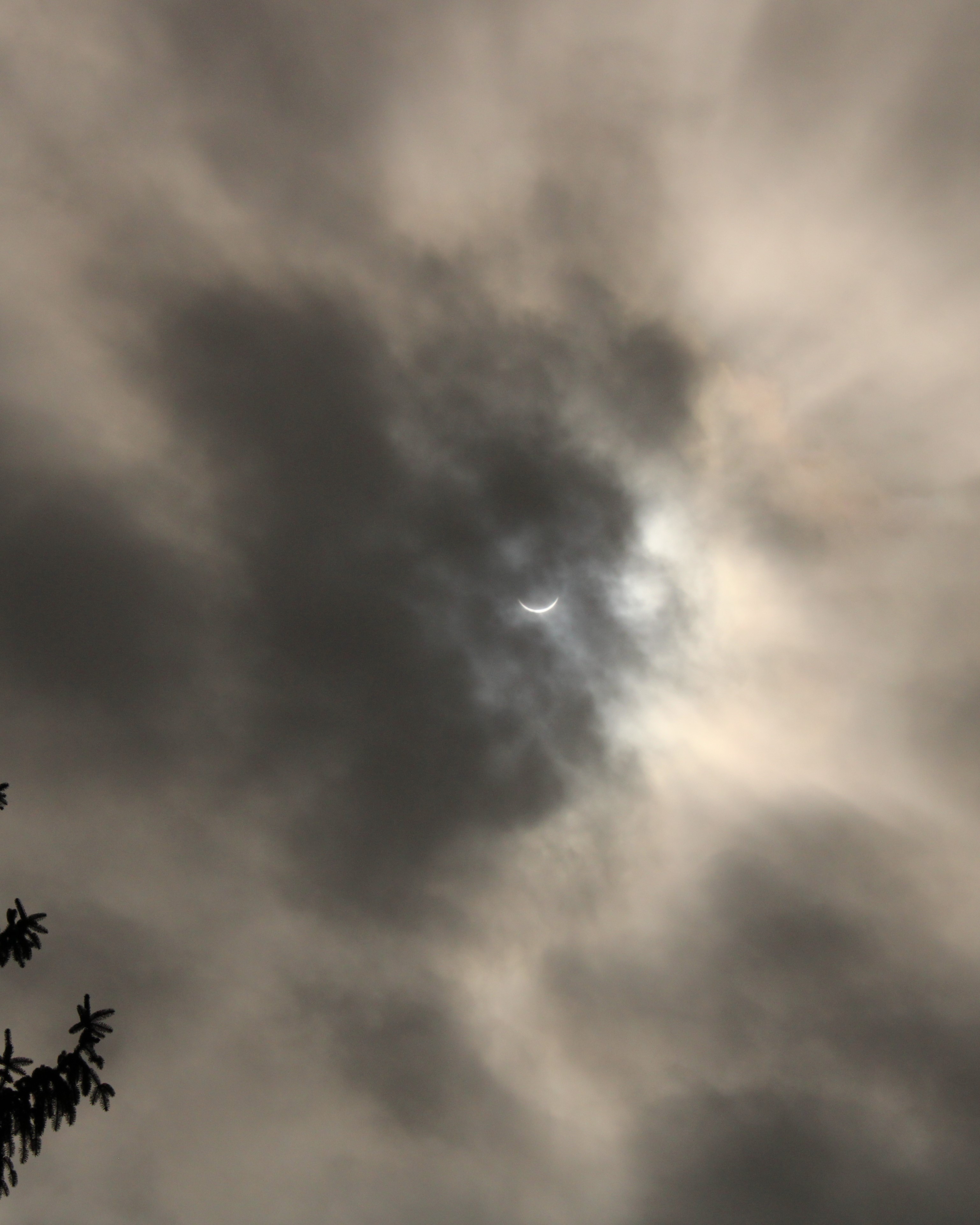 I suppose it was a good thing that it was so cloudy we didn’t need our special eclipse-viewing glasses to see where the phenomenon ought to be. And there were a few brief seconds when the clouds were thin enough that we could see the sliver that the sun had become, hiding behind the moon. And it did get dark. The robins were singing up a storm as the day moved toward what looked like dusk. A few street lights came on. It was eerie and really cool.